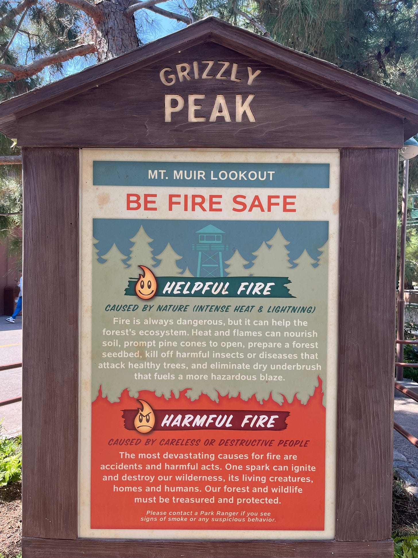 Outside Soarin’, in California Adventure’s firefighting-themed Grizzly Peak Airfield, there’s a sign explaining the difference between “helpful fire” and “harmful fire”: